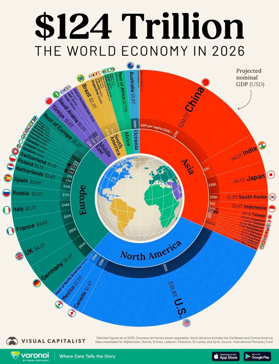 Расстановка лидеров остаётся прежней: США — с прогнозируемым ВВП в $31,8 трлн (по-прежнему крупнейшая экономика мира), Китай — $20,7 трлн, Германия — $5,3 трлн, Индия — $4,5 трлн (удерживает место, обогнав Японию ещё в 2025 году).