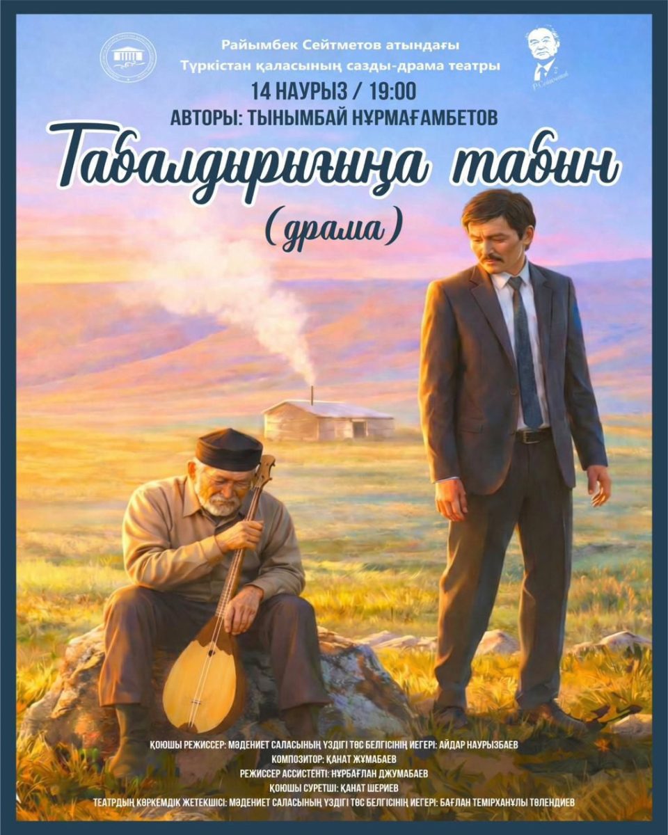 Бүгін Райымбек Сейтметов атындағы Түркістан қаласының сазды-драма театры көрермен назарына жазушы Тынымбай Нұрмағанбетовтің «Табалдырығыңа табын» драмасын ұсынады.